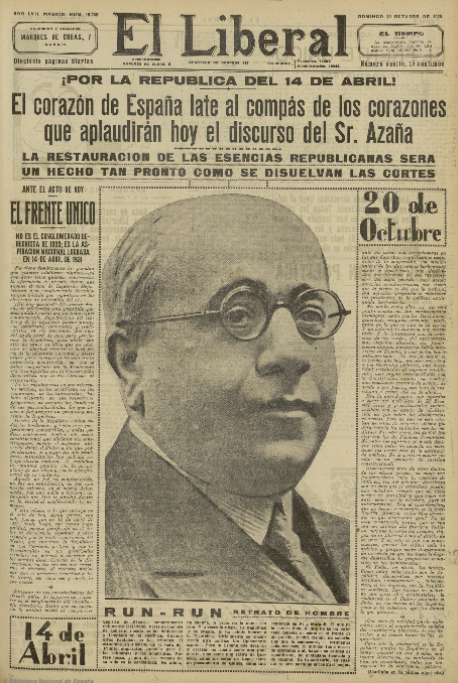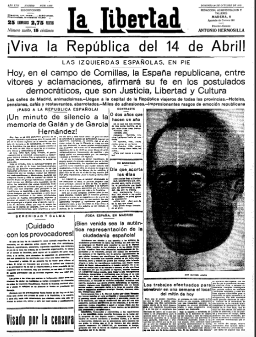 Se presentan a continuación las portadas de los cuatro principales diarios republicanos que se publicaron en aquella jornada, el día en el que #ManuelAzaña dio su famoso mitin en el campo de #Comillas, cerca del río Manzanares. Si La Libertad y El Liberal hicieron propaganda en ellas de ese evento político, El Sol dio cabida en ella a dos artículos de #JoséMorenoVilla "Dos damas en Almazán" y de #JoseCarner "Correligionarios".