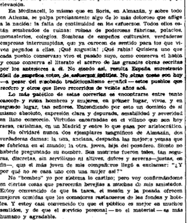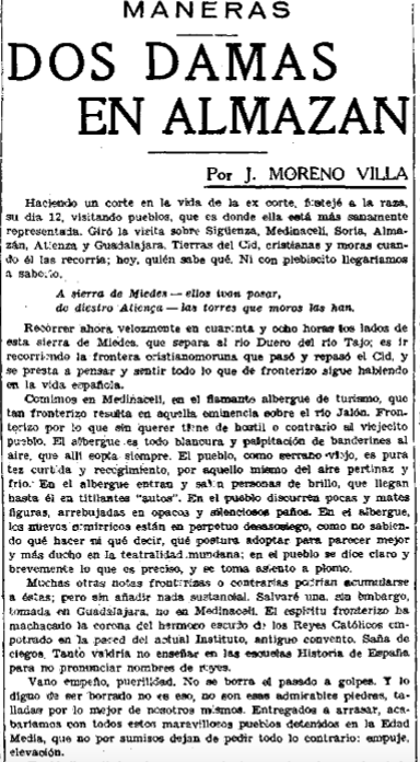 En el campo de la cultura cabe destacar el artículo de #JoséMorenoVilla en la primera página del diario El Sol en el que recogía sus impresiones del viaje de cuarenta y ocho horas que había hecho una semana atrás por tierras del Cid, a ambos lados de la sierra de Miedes, en las actuales provincias de #Guadalajara y #Soria. En él había disfrutado del confort del albergue del Patronato Nacional de #Turismo recién inaugurado en #Medinaceli, construido en una eminencia sobre el río Jalón.