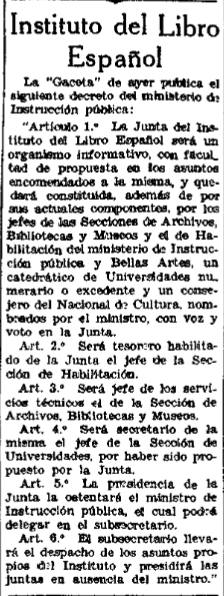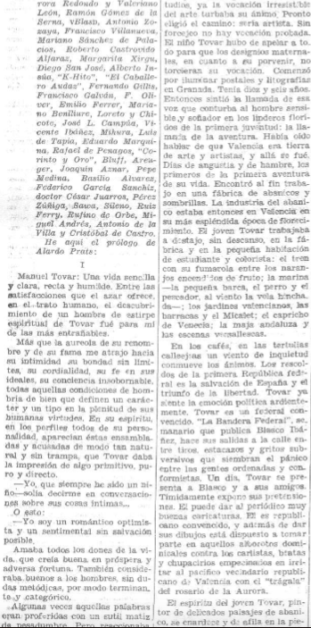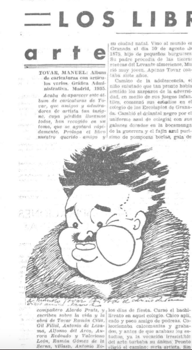 Ese mismo periódico informaba de la creación del Instituto del #Libro Español, insertando el decreto oficial del ministerio de Instrucción Pública que lo constituía, y en su sección de libros se hacía eco de la reciente edición del libro titulado Album Tovar que recogía una antología de dibujos del notable caricaturista #ManuelTovarSiles, que había fallecido, añadiendo el prólogo del periodista republicano Alardo Prats, quien en su exilio en México escribiría un libro titulado La ruta de Humboldt.