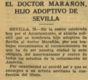 Por otra parte, Ahora también siguió haciéndose eco del #congresointernacional de americanistas que se había celebrado en #Sevilla, bien insertando una fotografía de algunos de los congresistas cuando visitaron la Cartuja de #Jerez de la Frontera, o haciéndose eco de un acuerdo del ayuntamiento de #Sevilla nombrando hijo adoptivo de la ciudad hispalense a #GregorioMarañón por su labor como presidente del comité organizador de ese evento científico.