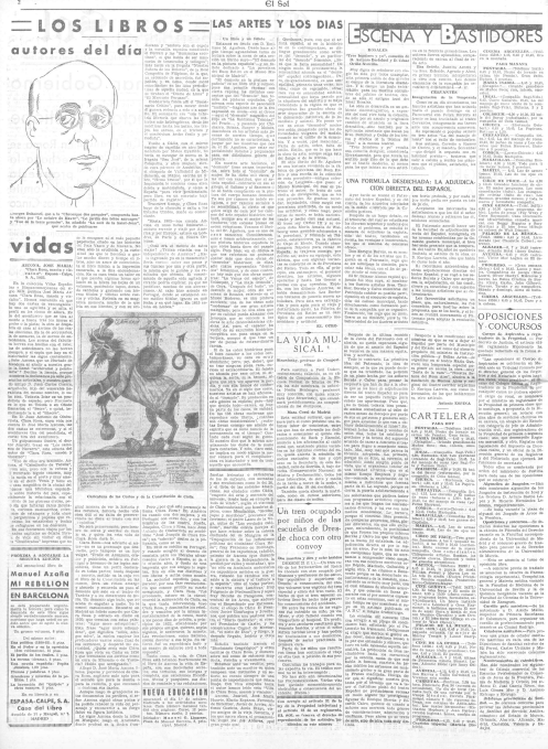 El Sol, por su parte, en su página cultural efectuó una amplia reseña del libro "Clara Rosa, masón y vizcaíno" que el bibliófilo navarro #JoséMaríaAzcona (1882-1951) había dedicado a la fascinante vida del fraile revolucionario #JuanAntonioOlabarrieta (1763-1822) en la que se insertaba una curiosa caricatura satírica de las Cortes de #Cádiz. Y su crítico de arte, que firmaba con el seudónimo de #ElOtro encomió la reciente publicación El #desnudo en la pintura española del crítico de arte #EmilianoMAguilera (1905-1975), que era por entonces un destacado militante socialista y el folleto que había publicado el año anterior La #porcelana del #BuenRetiro en el #MuseoMunicipal de #Madrid.