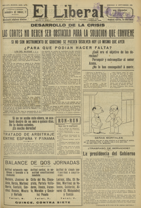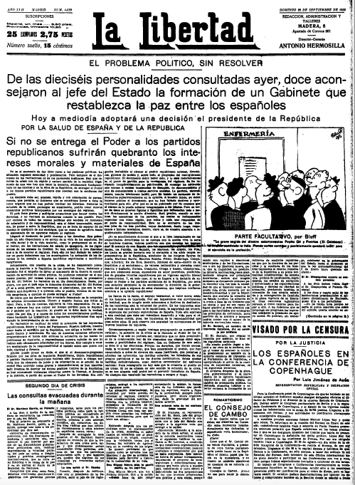 Se presentan las portadas de cuatro diarios madrileños publicados ese día: Ahora, El Sol, La Libertad y El Liberal.