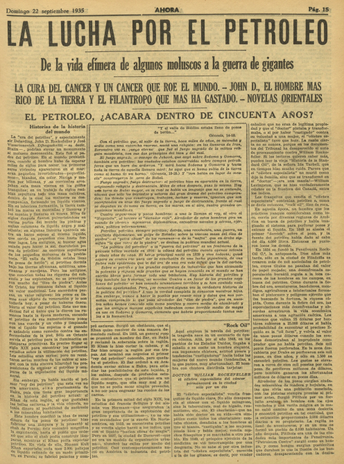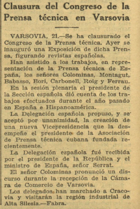 En el ámbito de las cuestiones técnicas un colaborador de Ahora, que firmaba con el seudónimo #Kim, presentó un amplio y detallado reportaje sobre la explotación del #petróleo preguntándose si ese recurso energético subistiría medio siglo después. También ese diario informó brevemente de una fiesta de #aviación celebrada en la población leridana de #Bellpuig. Y dio cuenta de la clausura en #Varsovia de un congreso de la #prensatécnica donde la delegación española consiguió que el representante de #Cuba se incorporase al comité directivo de esa asociación internacional.