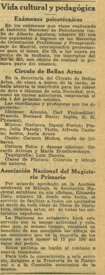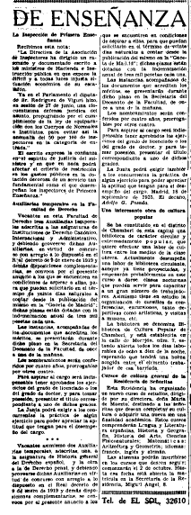 En el campo educativo tanto Ahora como El Sol informaron a sus lectores de diversos asuntos relacionados con la vida pedagógica y con cuestiones de enseñanza. El primero diario, entre otras cuestiones, dio noticia de los exámenes que estaba realizando el #InstitutoNacionaldePsicotecnia ubicado en la madrileña calle de #AlbertoAguilera. El segundo informaba de la #bibliotecapopular que se acababa de abrir en el barrio de #Chamberí y del curso de cultura general que había organizado la #ResidenciadeSeñoritas