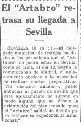 También ese diario insertó un suelto en el que se recogía una información de Sevilla anunciando que el buque Artabro, insignia de la expedición del capitán Iglesias al #Amazonas, retrasaba su llegada a la capital andaluza, desde donde tenía prevista su partida al continente americano, viaje que no llegaría a realizarse.