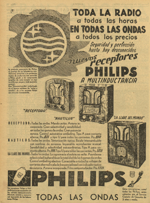 Y también ese diario en un suelto de su página literaria se congratulaba de que la emisora Unión Radio tuviese previsto dar cabida en sus ondas a otros escritores que acompañasen a #RamónGómezdelaSerna en sus divagaciones radiofónicas seguidas con interés por los radiooyentes, que crecían en progresión geométrica en la España republicana, por lo que también abundaban los anuncios publicitarios como el que insertó Ahora de la empresa Philips.