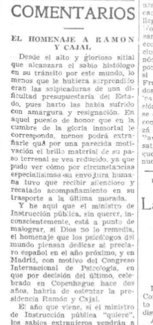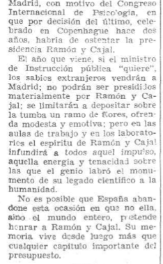 En el ámbito científico cabe destacar el editorial del diario El Sol a propósito del homenaje a #Cajal que estaban preparando los organizadores del próximo #congresointernacional de #Psicología que se pretendía celebrar en Madrid en algún momento del segundo semestre de 1936.