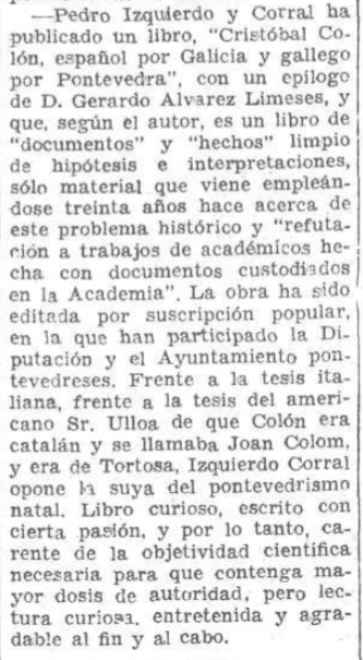 A su vez La Voz en su sección cultural se hizo eco de un libro publicado por la Junta de Iconografía Nacional con motivo de la celebración del Día de la Raza, de otra obra en la que se defendía la tesis de que #Colón era gallego y se ofrecían informaciones de las revistas #Tensor, impulsada por #RamónJSender y #Revistahispanicamoderna, alentada por #FedericodeOnis.