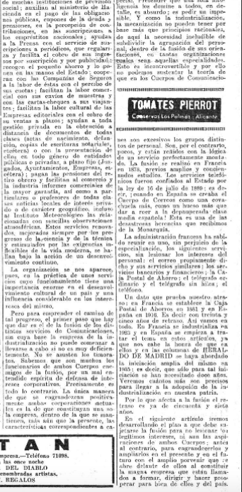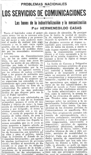A su vez Heraldo de Madrid insertó un texto de #HermenegildoCasas, político próximo en aquel momento al partido de Martínez Barrio Unión Republicana, tras haber sido diputado por el PSOE, en el que abogaba por la unión de los cuerpos de correos y telégrafos para agilizar las comunicaciones en el territorio español con el objetivo de impulsar su industrialización .