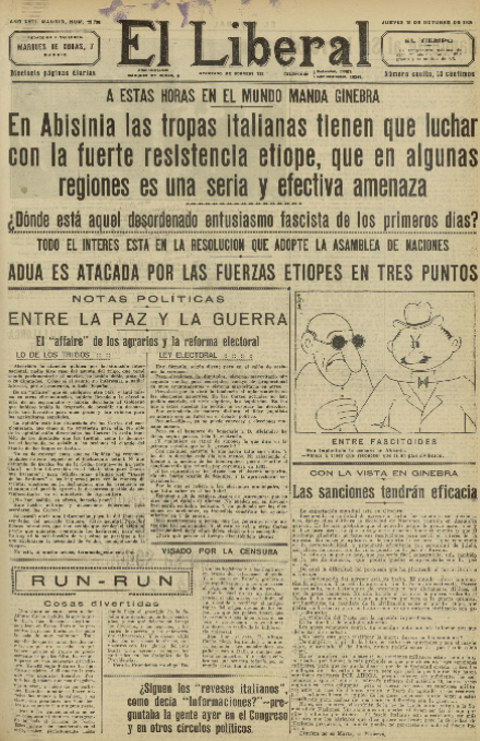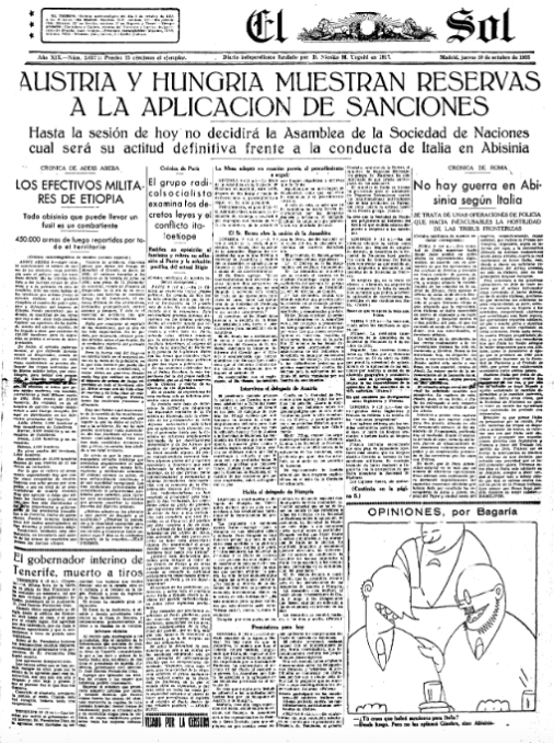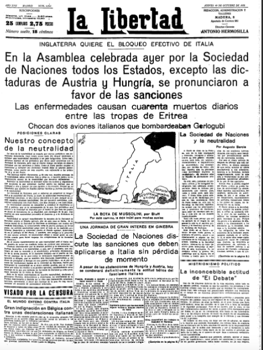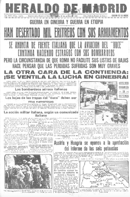Se presentan a continuación las portadas de seis diario republicanos editados en Madrid en esa jornada que reflejan la inquietud de la opinión pública española ante el desarrollo de la guerra ítalo-etiope. La Voz también se hizo eco de un golpe militar en Grecia que tenía como objetivo el restablecimiento de la monarquía en el país heleno.