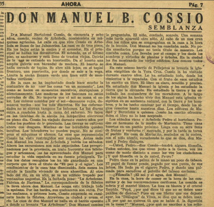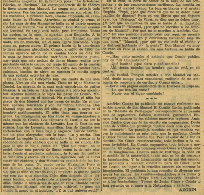 En la esfera de la #educación #Azorín en el diario Ahora se sumó al balance que muchos autores estaban haciendo de la obra y el legado del pedagogo #Cossío, elogiando el "ensayo soberbio" que acababa de publicar #AméricoCastro en las páginas de la Revista de Pedagogía sobre el impulsor de las Misiones Pedagógicas y ciudadano de honor de la República.