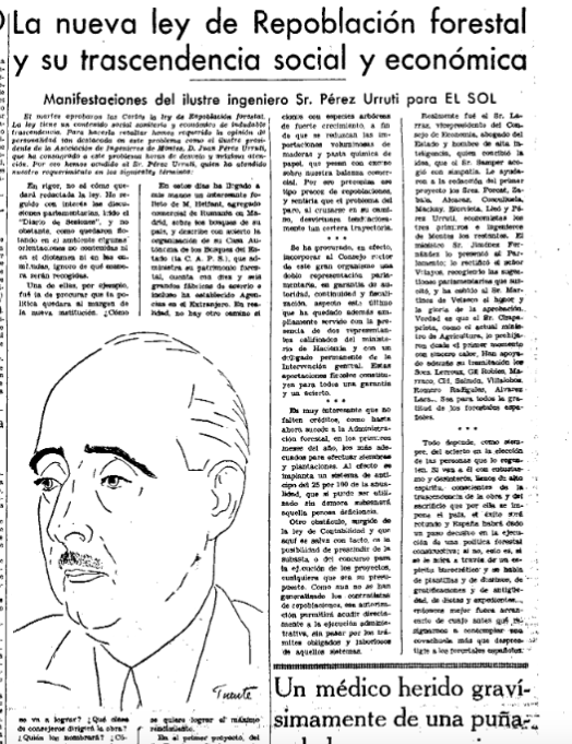 En el mundo de las técnicas y de la ingeniería cabe destacar la entrevista que se le hizo en El Sol a #JuanAntonioPérezUrruti, presidente de la Asociación de #Ingenieros de Montes, a propósito de la nueva ley de repoblación forestal aprobada por el Parlamento español. Antiguo diputado por el Partido Conservador durante la dictadura de Franco llegaría a ser inspector general del Cuerpo de Ingenieros de Montes, entre el 4 de julio de 1951 y el 6 de febrero de 1952.