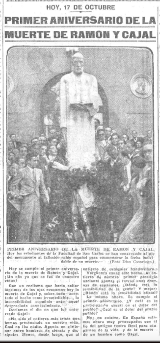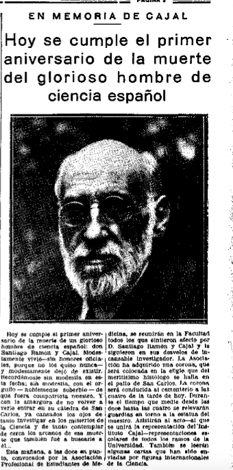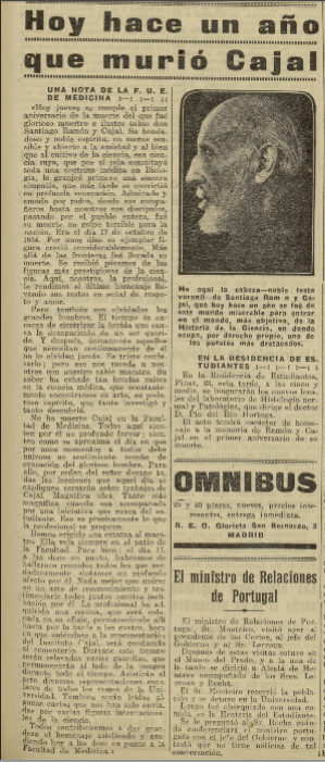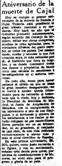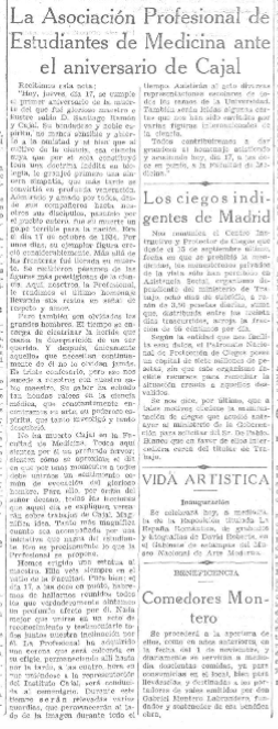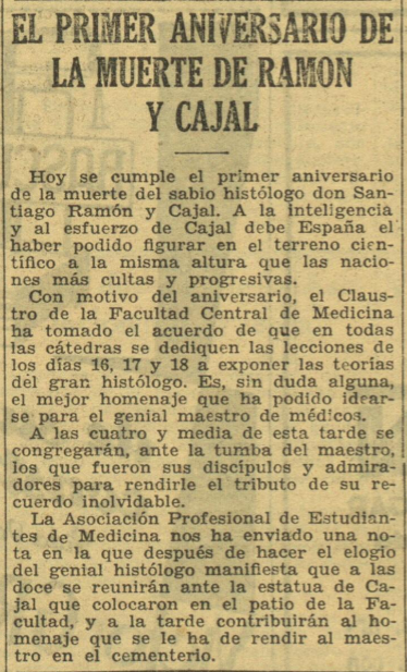En el ámbito científico cabe resaltar cómo cinco de esos seis periódicos -todos excepto La Voz- se hicieron eco de las actividades organizadas en ese día en diversos lugares de Madrid, como la Facultad de Medicina y la Residencia de Estudiantes, para homenajear a #Cajal al cumplirse el primer aniversario de su fallecimiento.