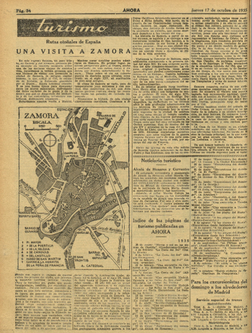 Los conocimientos geográficos seguían propagándose en las hojas dedicadas a promover el turismo interior como la publicada ese día por Ahora en la se ofrecía un extenso reportaje sobre la ciudad de #Zamora.