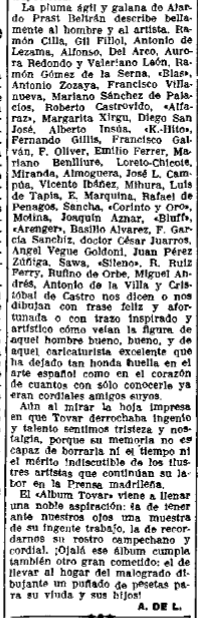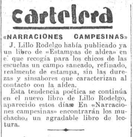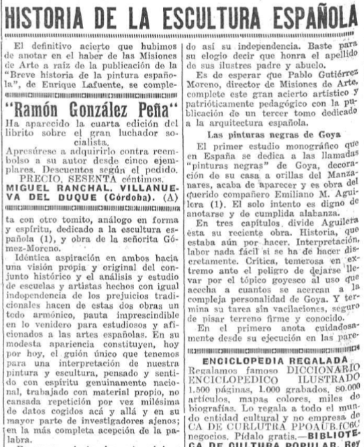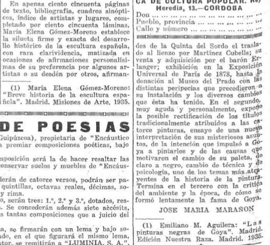 El crítico #JoséMariaMarañon en Heraldo de Madrid reseñó dos libros relacionados con la #historiadelarte español, como la Breve historia de la escultura española de #MariaElenaGomezMoreno. Ese periódico también reseñó el libro Narraciones campesinas del pedagogo #LilloRodielgo.