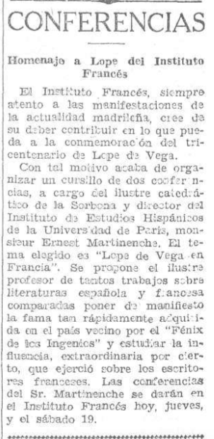 Las relaciones culturales con otros países europeos era intensa. El Sol informó del ciclo de conferencias que iba a impartir en el Instituto Francés de Madrid el hispanista #ErnestMartinenche sobre la influencia de #LopedeVega en la cultura francesa. Y La Voz dio una breve noticia de la inauguración la mañana de aquel día de una importante exposición del artista romántico inglés #DavidRoberts que visitó España en 1832 y 1833.