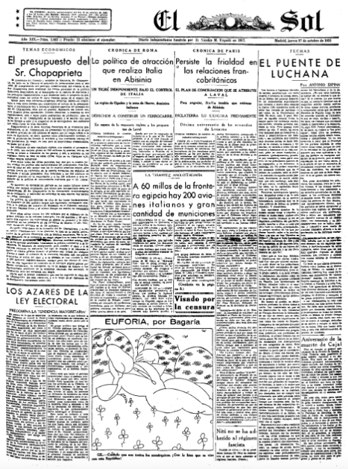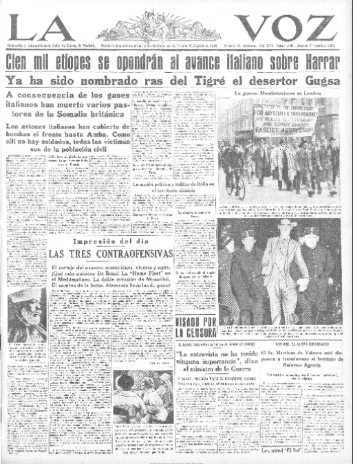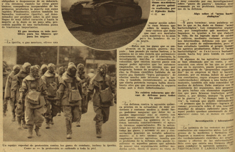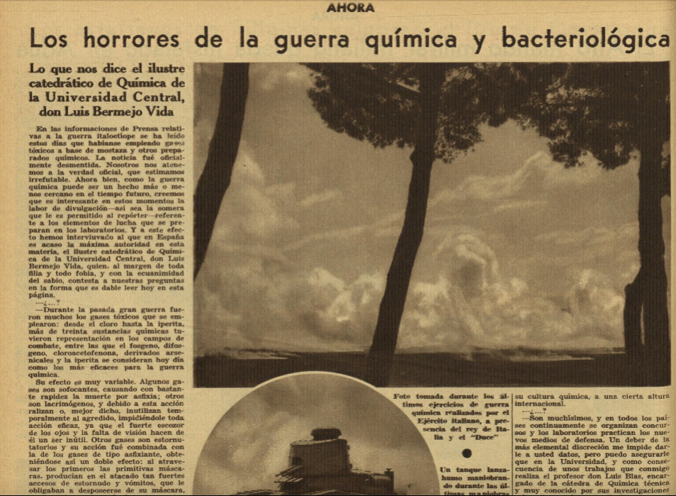 Un reportero del diario Ahora entrevistó al catedrático de Química de la Universidad de Madrid, #LuisBermejoVida para obtener información sobre los efectos de la guerra química y bacteriológica en el contexto del conflicto bélico entre italianos y etíopes.