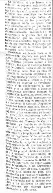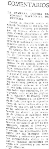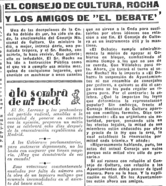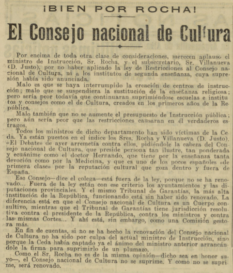 Este intenso movimiento cultural se producía en un marco de fuertes tensiones ideológicas y políticas, como lo revela la campaña desencadenada por el portavoz de la CEDA, el diario El Debate, contra la actuación del Consejo Nacional de Cultura, cuya labor fue respaldada aquel día por un editorial del diario El Sol, y sueltos de El Liberal y Heraldo de Madrid.