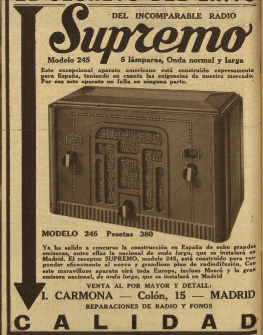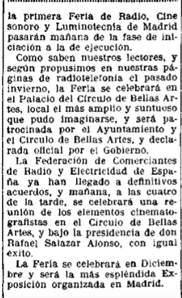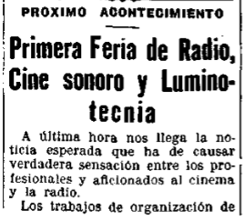 También se seguía con gran interés las novedades relacionadas con la radiotecnia. Así La Libertad anunció la próxima celebración en #Madrid de la primera feria de #radio #cinesonoro y #luminotecia y Ahora insertó un anuncio de una firma española de producción de aparatos de radio que basaba su publicidad en el hecho de que la creación de un plan ambicioso de radiodifusión, basado en el lanzamiento de una gran emisora nacional de onda larga, hacia necesaria su adquisición.