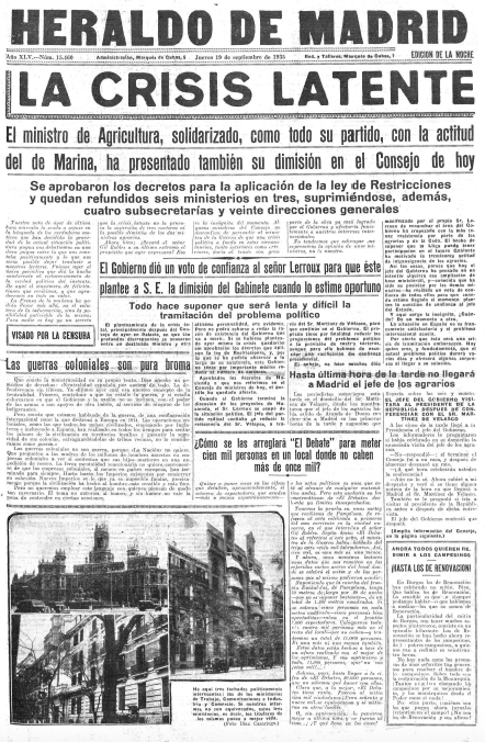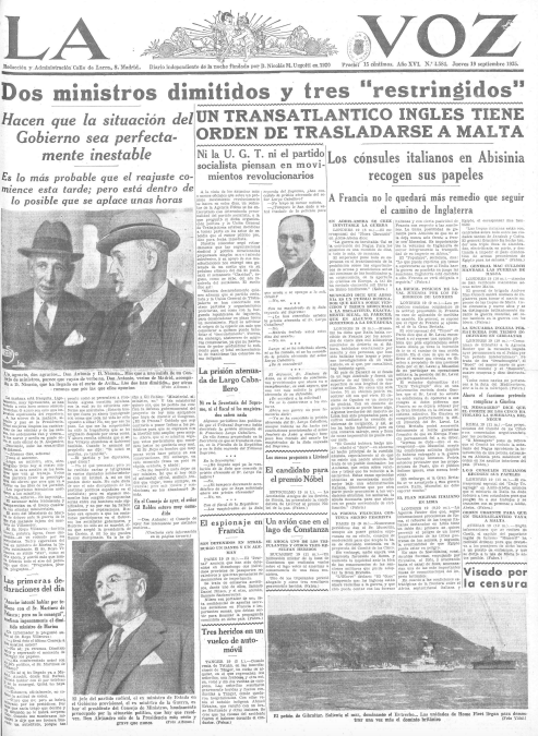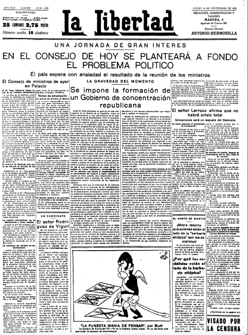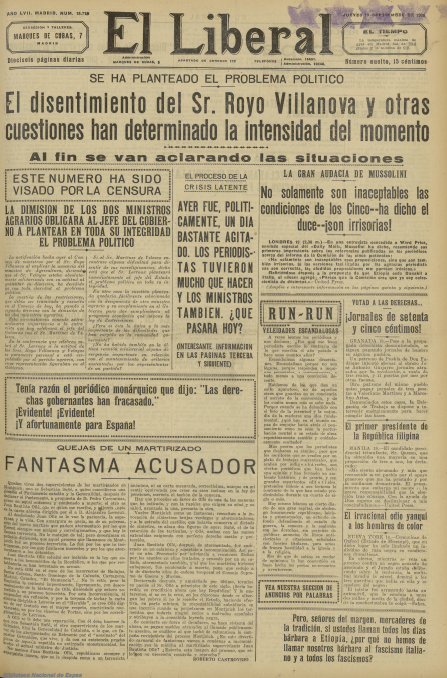 He aquí las portadas de seis periódicos madrileños de ese día, ubicados en la órbita de las diferentes corrientes republicanas, cuatro matutinos: Ahora, El Sol, La Libertad y El Liberal y dos vespertinos: Heraldo de Madrid y La Voz. Llama la atención en la primera página de El Sol el artículo de Gregorio Marañón titulado Medicina e Historia.