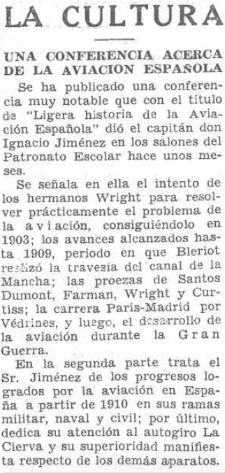 La Voz, por su parte, en su página cultural se hacía eco de la publicación de Ligera historia de la aviación española del capitán Ignacio Jiménez Martín-Plaza (1898-1959), cuyo origen estaba en una conferencia que había dado en el #PatronatoEscolar.