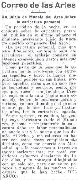 la reproducción que hacía Heraldo de Madrid de un artículo de Correo de las Artes donde #ManueldelArco reflexionaba sobre el significado de la caricatura personal para la que se necesitaban grandes dotes de observación.