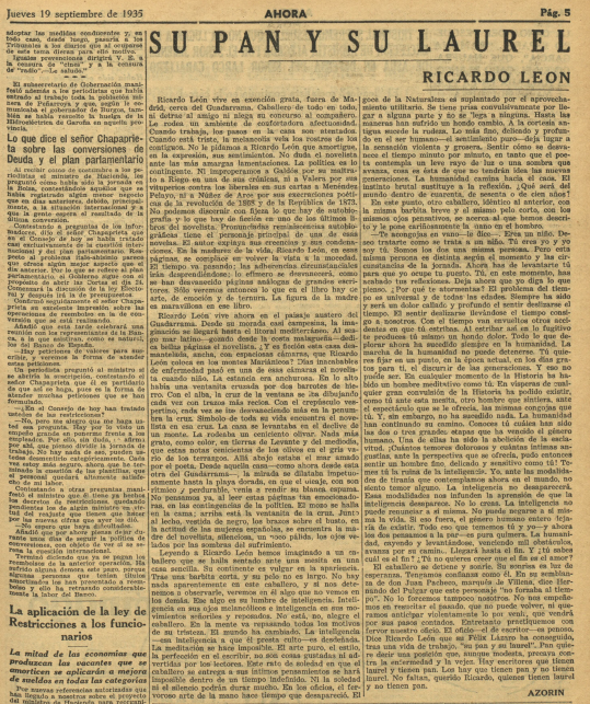 la publicación por Ahora del artículo de #Azorín dedicado a #RicardoLeón, las páginas de El Sol, El Liberal, Heraldo de Madrid y La Voz dedicadas al mundo de los libros y actividades artísticas.