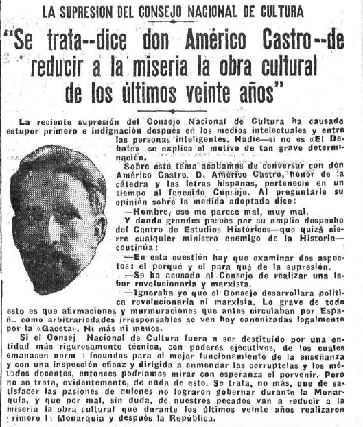 Y Heraldo de Madrid publicó una breve entrevista a #AméricoCastro en la que este investigador del #CentrodeEstudiosHistóricos denunciaba que la supresión del #ConsejoNacionaldeCultura representaba "reducir a la miseria la obra cultural de los últimos veinte años".