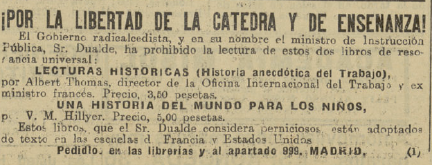 A su vez El Liberal insertó un anuncio de defensa de la libertad de cátedra y de enseñanza al denunciar dos libros prohibidos por el ministro de Instrucción Pública y Bellas Artes #JoaquínDualdeGómez.
