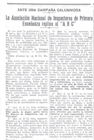 También ese diario dio cobertura a una réplica al ABC firmada en #Cáceres el 14 de septiembre de 1935 por el Presidente de la #AsociaciónNacionaldeInspectoresdePrimeraEnseñanza, #JuvenaldeVegayRelea (c.1894-1979), quien se quejaba en su escrito de la campaña de descrédito organizada por ese periódico contra la labor de ese cuerpo docente.