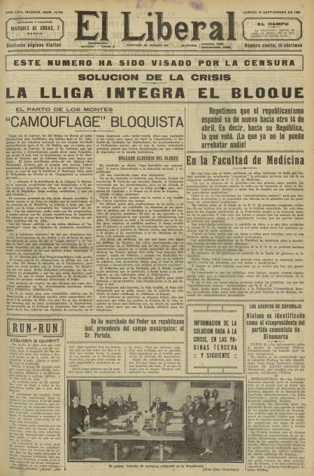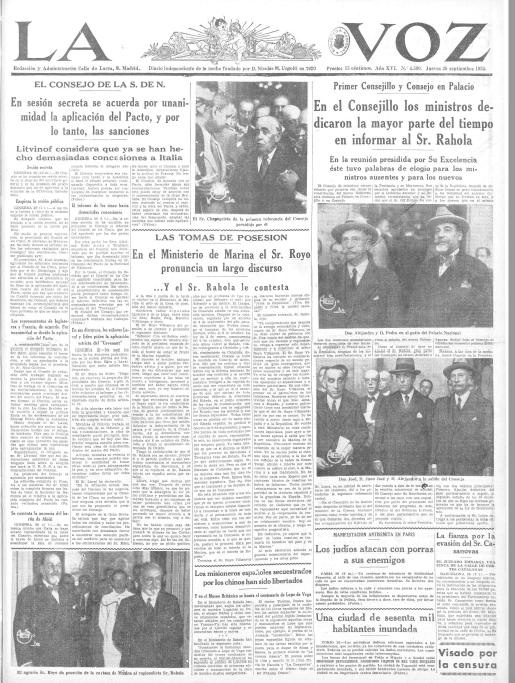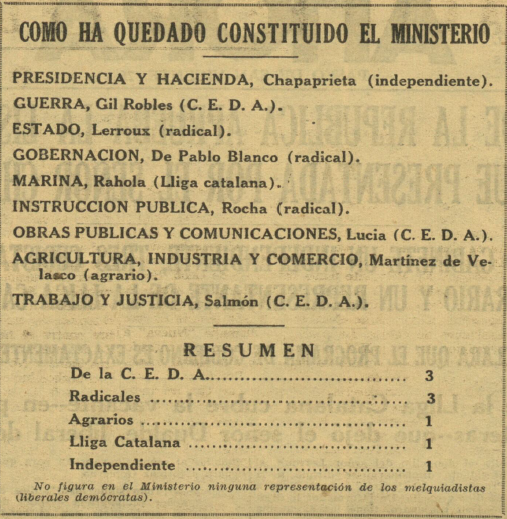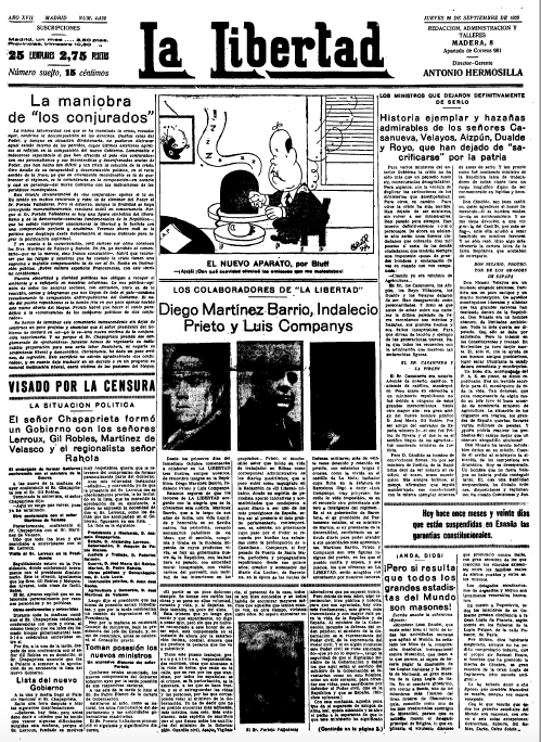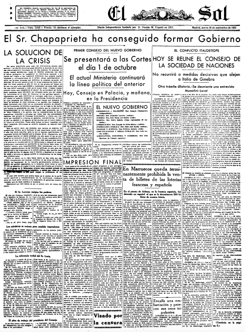 Se exponen a continuación las portadas de seis diarios publicados en #Madrid en el día en el que dio sus primeros pasos el gabinete constituido por #Chapaprieta.