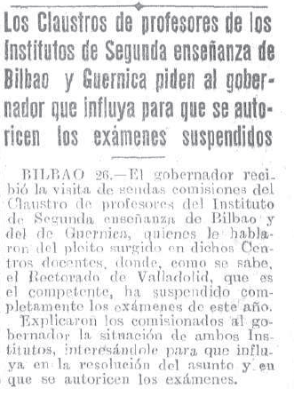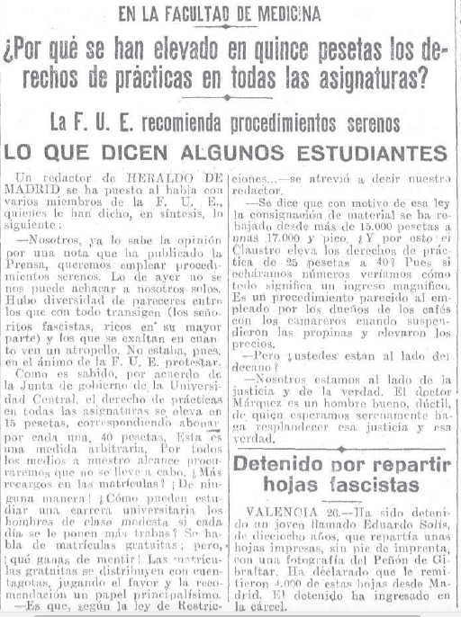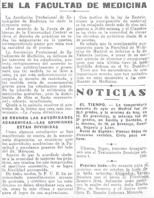 Por su parte Heraldo de Madrid se hizo eco del malestar existente en la Facultad de #Medicina de la #UniversidaddeMadrid ante la subida de tasas para hacer prácticas y de las gestiones de los claustros de los #institutos de #Bilbao y #Guernica para que el gobernador solicitase al rector de la #UniversidaddeValladolid autorización para efectuar los exámenes que se habían suspendido en esos centros de enseñanza.