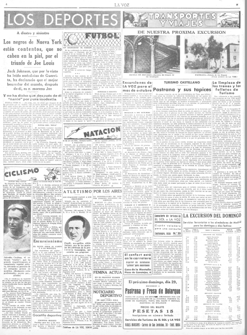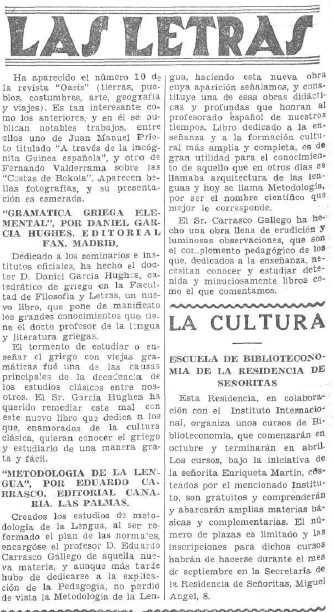 A su vez La Voz en su página literaria publicaba un nuevo artículo de #RafaelSuárezSolís sobre literatura de #Cuba y daba noticias sobre: un descubrimiento del arqueólogo alemán #FritzBuck en la costa peruana; se hacía eco de la edición del número 10 de la revista Oasis y hacía reseñas elogiosas de la Gramática griega elemental de #DanielGarcíaHugues, publicada por la editorial Fax de Madrid y de Metodología de la lengua por #EduardoCarrascoGallego, quien era profesor en la #EscuelaNormal de #LasPalmas y publicada en esa ciudad por Editorial Canaria.