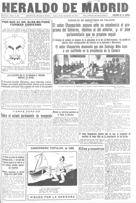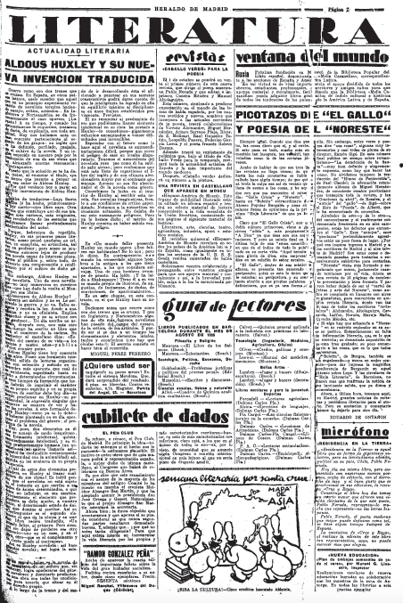 Por su parte Heraldo de Madrid en su página de literatura incluía dos artículos de #MiguelPérezFerrero sobre la traducción al castellano del libro Un mundo feliz de #AldousHuxley y el de #EduardodeOntañón "Picotazos de El Gallo y Poesía del Noreste" y las secciones: Revistas, en la que se mencionaba la publicación de Caballo verde para la poesía, dirigida por #PabloNeruda; Guía de lectores en la que se informaba de los libros publicados en Barcelona durante el mes de agosto de 1935; Cubilete de datos, en la que se informaba de la reorganización de la sección española del Pen Club; y Micrófono donde se informaba de la reedición ampliada de "Residencia en la Tierra", el libro de poemas de #PabloNeruda.
