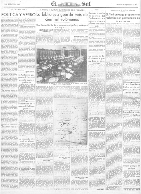 El Sol informó de la salida del número 10 de la revista Oasis, dedicada a suministrar informaciones y estudios geográficos, del número de septiembre de la revista Norte, publicada en Bilbao, y del número 31 de Economía española. Y publicó dos largos artículos. Uno de #AntonioEspina sobre el libro de #ManuelAzaña Mi rebelión en #Barcelona y el otro de #AlardoPrats sobre la exposición que estaba preparando el #Ateneo de #Madrid para conmemorar el centenario de su fundación que incluía una conversación de ese periodista con el bibliotecario de esa institución #BernardoGCandamo