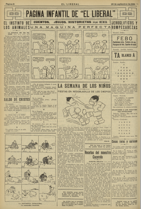El Liberal, a través de su página infantil, ofreció lecciones de #zoología a sus pequeños lectores explicando la astucia de un pájaro silbador y hacía propaganda del ideario republicano a través de máximas del tenor siguiente: "Ese magnífico grupo escolar al que asistes para hacerte un hombre de provecho lo ha construido la República; No olvides que el verdadero patriotismo consiste en trabajar y en estudiar para engrandecer tu patria; Cuando estés en tu camita blanda y caliente acuérdate de que muchos niños no tienen donde dormir".