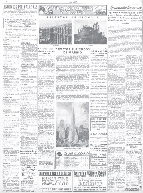 En otros aspectos culturales cabe apreciar el contraste, expresivo de la situación del país, de dos páginas de ese diario: una dedicada a elogiar las bellezas turísticas de #Segovia, la otra a explicar la campaña desencadenada en #Madrid para erradicar la mendicidad.