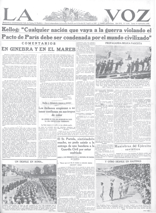 En las informaciones culturales cabe destacar dos artículos en las páginas de La Voz . El de su colaborador #RafaelSuárezSolís, periodista de origen asturiano con fuertes vínculos con #Cuba quien en su artículo "Entre paréntesis. Una noticia" además de denunciar la situación del libro español en el mercado americano se hizo eco del retorno a Madrid de #JoséMaríaChacónyCalvo para proseguir sus tareas diplomáticas y sus investigaciones históricas. Y el de su crítico de arte #ÁngelVeguéyGoldoni "La riqueza artística del #PalacioNacional". En él informó de la reciente publicación de un libro homónimo, auspiciado por la #DirecciónGeneraldeBellas Artes, de 128 páginas que contenía una visión de conjunto de los tesoros artísticos de ese palacio y que estaba ilustrado con hermosas fotografías de #LuisLladó comentadas en cuatro lenguas: castellano, francés, inglés y alemán como reclamo para los turistas que lo visitasen.
