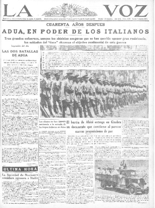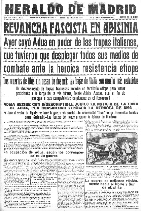 Estas son las portadas de los dos principales periódicos vespertinos que se publicaban en Madrid. En ellas las noticias sobre la invasión italiana de Etiopía cubrían toda la información.