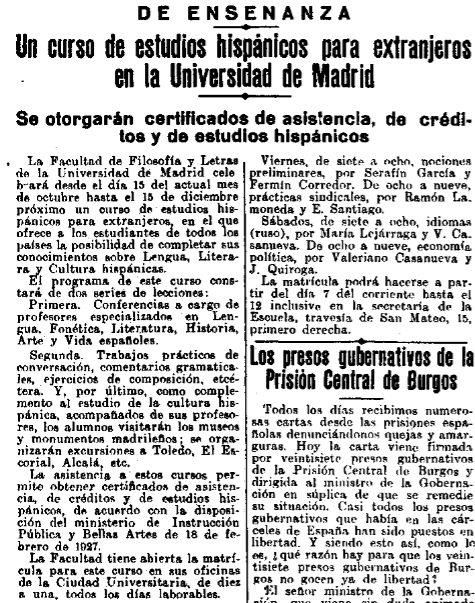 Por su parte Heraldo de Madrid informó de la organización por la Facultad de Filosofía y Letras de la #UniversidadCentral de un curso de español para extranjeros, que le hacía la competencia al que organizaba el Centro de Estudios Históricos de la #JAE.