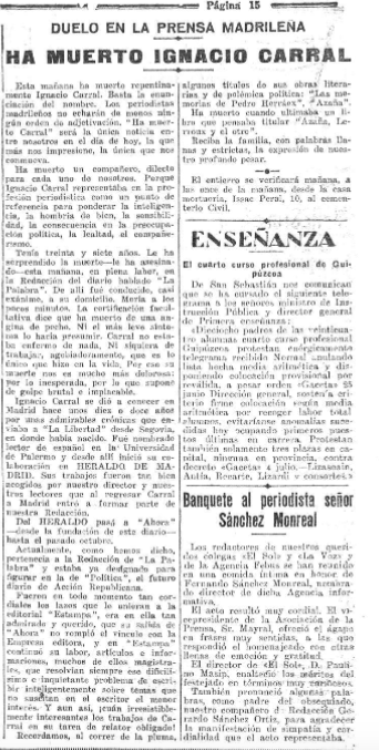 Heraldo de Madrid y La Voz se hicieron eco del fallecimiento repentino del periodista, escritor y profesor de #Filosofía en los #institutos #Lagasca y #CardenalCisneros #IgnacioCarral y en la página literaria de La Voz #ÁngelLázaro escribió un artículo sobre los #indianos como personajes literarios y se hizo una crítica del libro del diplomático mexicano e historiador #GenaroEstrada sobre las relaciones entre las #AcademiasdeBellasArtes de #Madrid y #México en el último tercio del #sigloXVIII