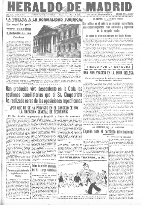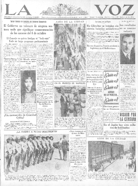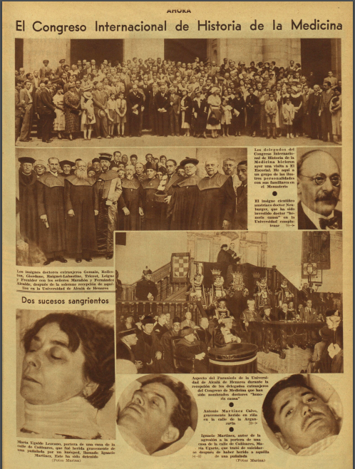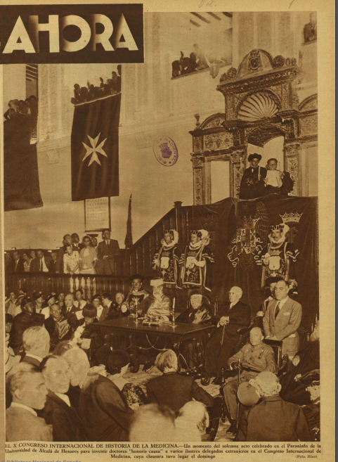 Se presentan las portadas de cinco diarios republicanos publicados en ese día. Tres matutinos: Ahora, - que insertó una foto del acto celebrado en el paraninfo de la Universidad de Alcalá de Henares de la concesión del doctorado "honoris causa" a varios de los participantes del #XCongresoInternacional de #HistoriadelaMedicina -