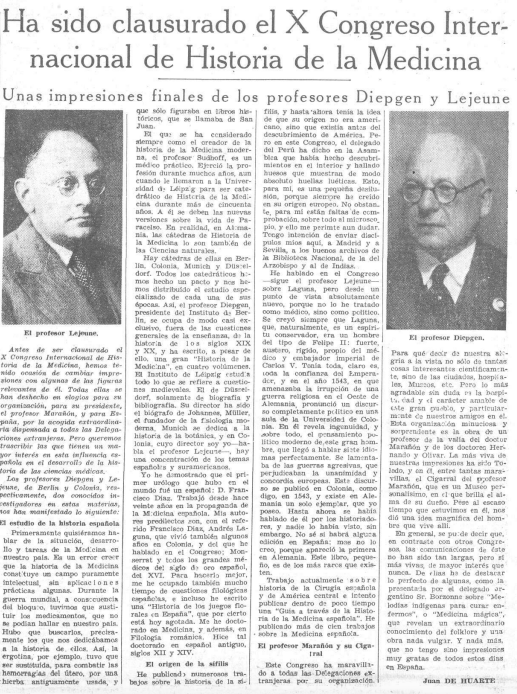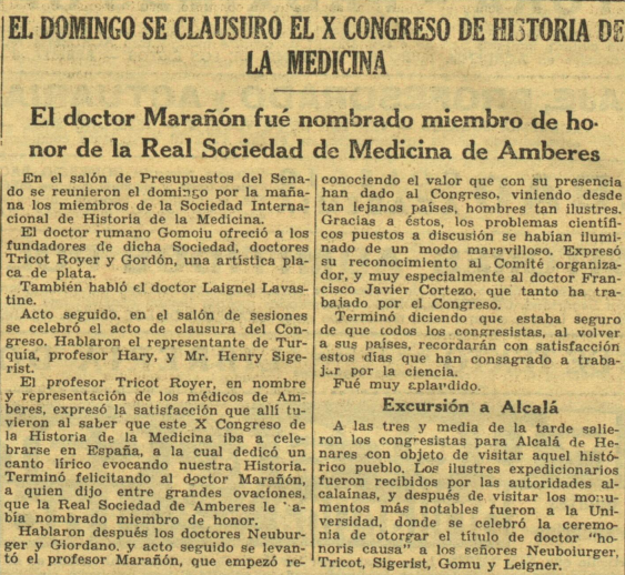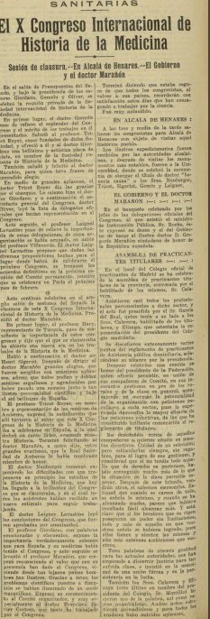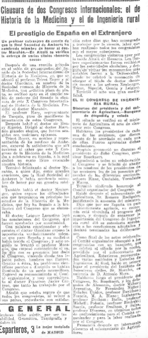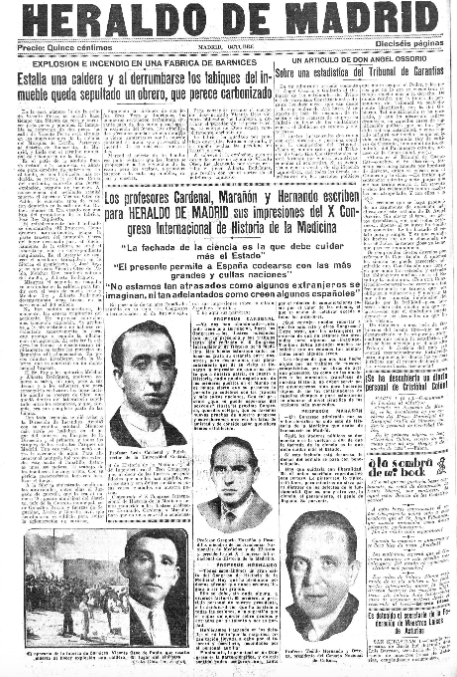 Las informaciones científicas estuvieron dominadas por la cobertura dada a la clausura del #XCongresoInternacional de #HistoriadelaMedicina, del que dieron noticias varios diarios como Ahora, El Sol, que plasmo las impresiones finales de los profesores #Diepgen y #Lejeune acerca del congreso, El Liberal y Heraldo de Madrid, que recogió reflexiones de #LeónCardenal, #GregorioMarañón y #TeofiloHernando sobre su desarrollo.