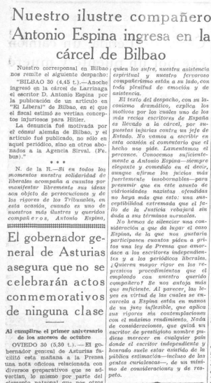 Diversos periódicos se hicieron eco del encarcelamiento del escritor #AntonioEspina tras una denuncia del cónsul alemán en #Bilbao por un escrito considerado injurioso contra #Hitler.
