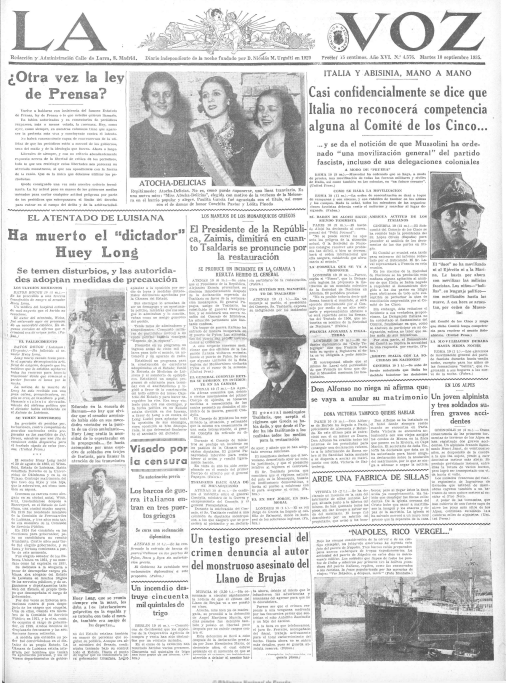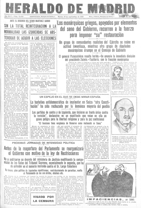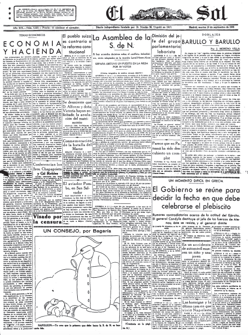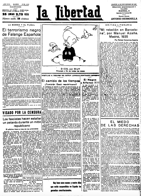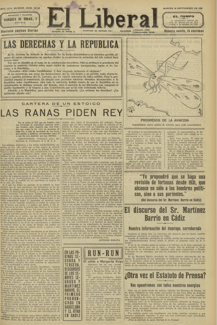 Se ofrecen las portadas de seis diarios madrileños correspondientes a esa jornada: cuatro matutinos: Ahora, El Sol, donde José Moreno Villa publica un notable artículo, La Libertad -en el que sobresale la reseña de Cansinos Assens al libro de Manuel Azaña Mi rebelión en Barcelona- y El Liberal, y dos vespertinos: El Heraldo de Madrid y La Voz.