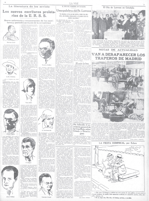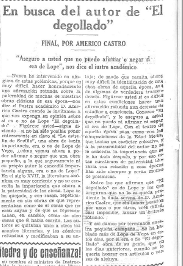 - noticias literarias entre las que cabe destacar dos de ellas aparecidas en La Voz. En una se solicitaba a #AméricoCastro su opinión sobre la posible autoría de #LopedeVega de la obra teatral "El degollado". En la otra #JoséMaríaPérez ofrecía un panorama de los escritores más destacados de la #UniónSoviética.