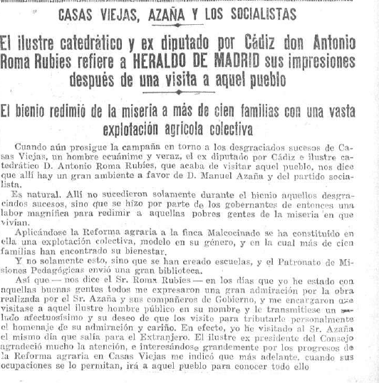 - A su vez el Heraldo de Madrid informó de la visita a Casas Viejas del catedrático de Latín del instituto de Jerez, y exdiputado del PSOE, #AntonioRomaRubies [Fontllonga (Lérida) 1872-Valencia 1967]