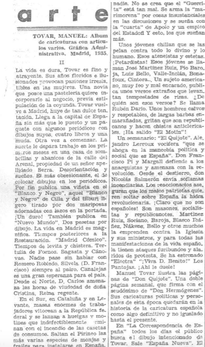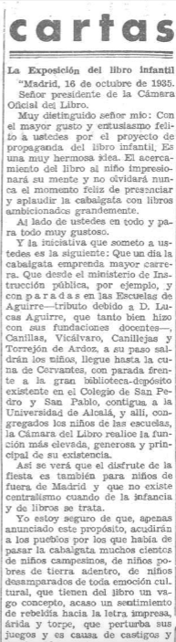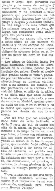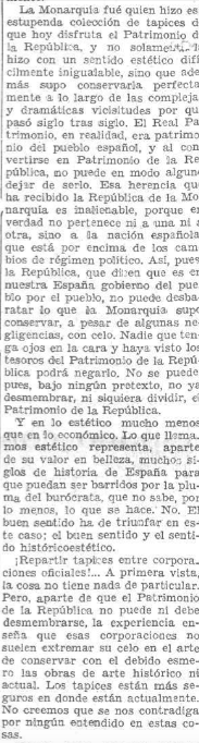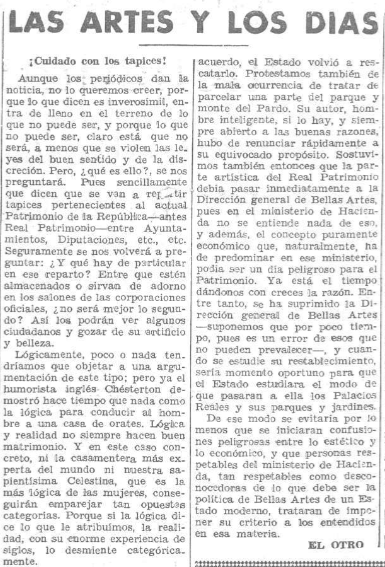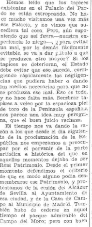 El Sol, por ejemplo, publicó una carta de #FranciscoHuertaCalope en la que proporcionaba ideas de cómo hacer llegar el libro infantil a las zonas rurales. Y un artículo de uno de sus críticos de arte solicitando que se protegiese la magnífica colección de tapices existentes en el palacio de #ElPardo.