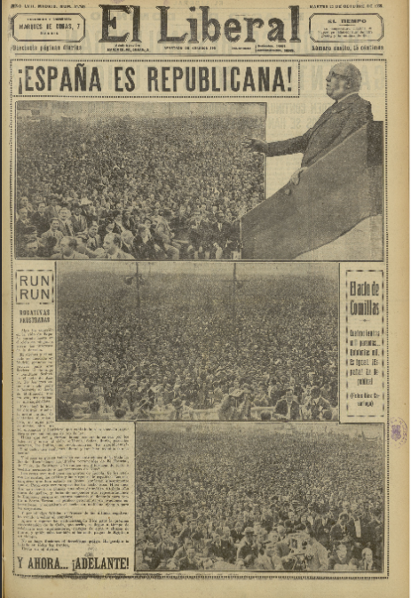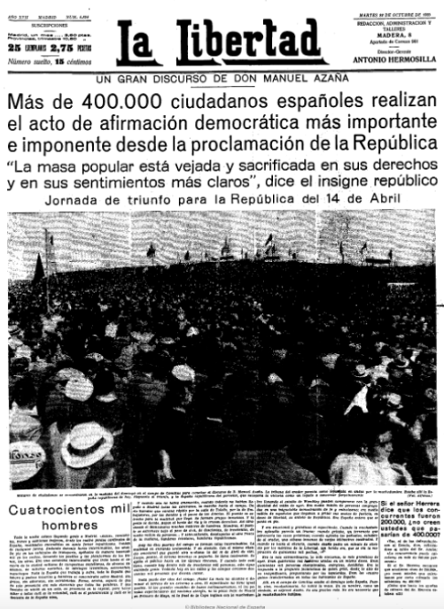 Se presentan a continuación las portadas de seis diarios republicanos que se publicaron en Madrid en aquella jornada. En algunos de ellos se encontraban valoraciones del significado del discurso pronunciado por #ManuelAzaña en el campo de Comillas dos días antes.