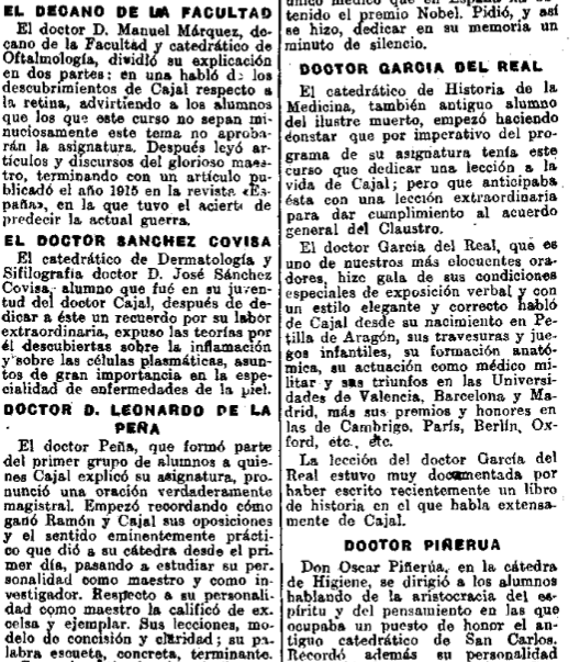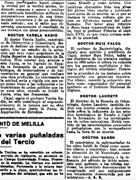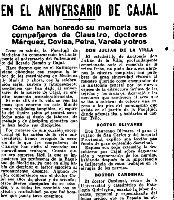 En el ámbito científico cabe destacar la cobertura dada por Heraldo de Madrid al homenaje que se había brindado en la Facultad de Medicina de la Universidad Central a #Cajal, con motivo de conmemorarse el primer aniversario de su fallecimiento.